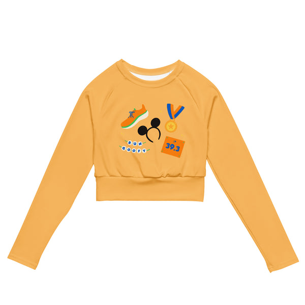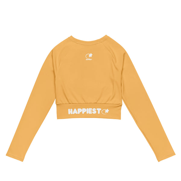 This long-sleeve crop top is made of recycled polyester and elastane, making it an eco-friendly choice for swimming, sports, or athleisure outfits. The crop top has a tear-away care label and a wide, double-layered waistline band for a comfortable fit.