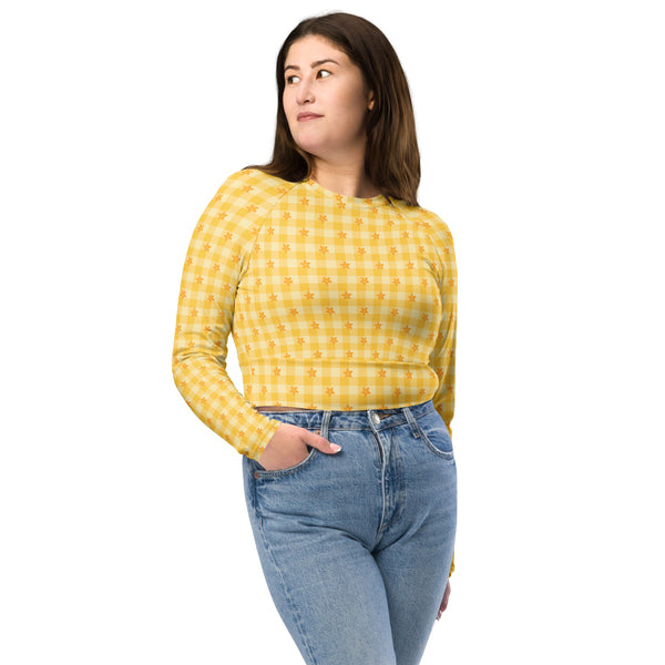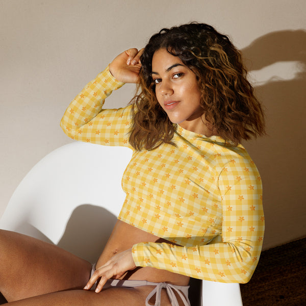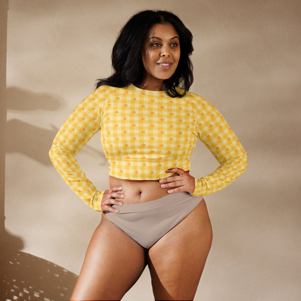 This long-sleeve crop top is made of recycled polyester and elastane, making it an eco-friendly choice for swimming, sports, or athleisure outfits. The crop top has a tear-away care label and a wide, double-layered waistline band for a comfortable fit.